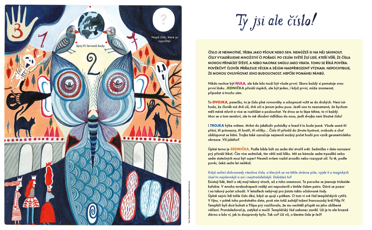 V magickém čísle 13 se věnujeme všem strašákům, příšerám, pověrám, hororům a strachu vůbec. Kde strach vzniká a jak se ho zbavit? Proč se někdy bojíme rádi? Děti zjistí, jak se nejlépe vypořádat s upírem a čeho se bojí jeleni, vyrobí si talisman pro štěstí, zahrají si na zombíky nebo stolní hru ve vlaku duchů. Přečtou si příběh o zamilovaném smrťákovi a uvaří čarodějnické pochoutky. Nechybí komiksy ani strašidelná angličtina a na výlet poletíte do Lisabonu. Obálku nakreslil Jindřich Janíček.