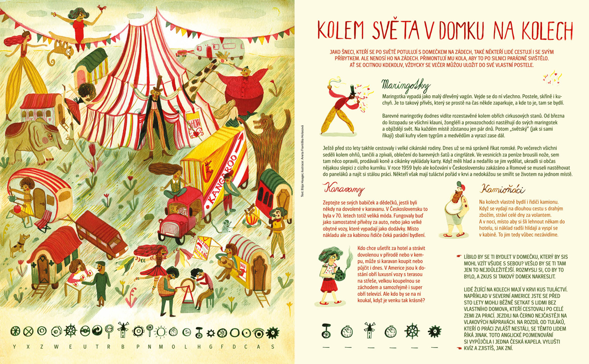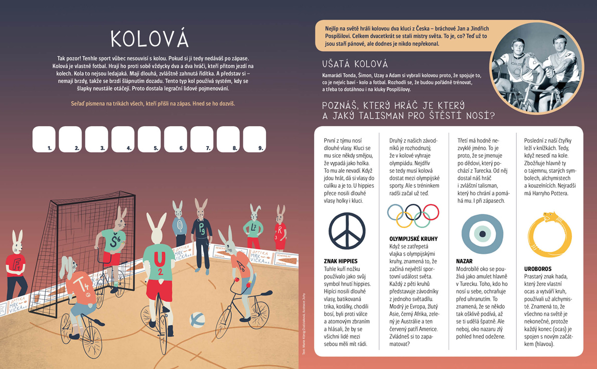 Kolo je magický tvar umožňující neustálý pohyb a nekonečné opakování. Děti se dočtou o historii tohoto užitečného vynálezu, vyluští, co to je kolohnát, kolonáda či kolomaz, vyzkouší bludiště kruhových objezdů, zahrají si kolovou s legendárními bratry a vyrobí cyklistický větrný kolotoč. S Rockym a Terkou odhalí, jak vznikají kruhy v obilí, a s Dr. Rackem projedou Masarykův okruh. Angličtina se věnuje přírodním cyklům a na výlet jedeme do Salzburgu. Obálku nakreslila Simona Čechová.