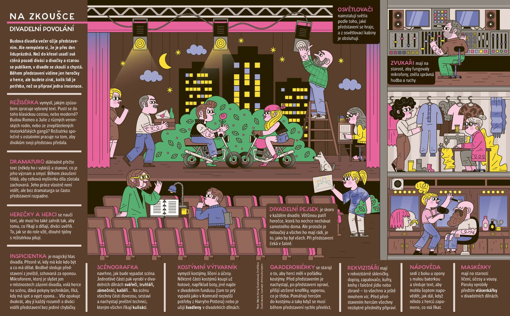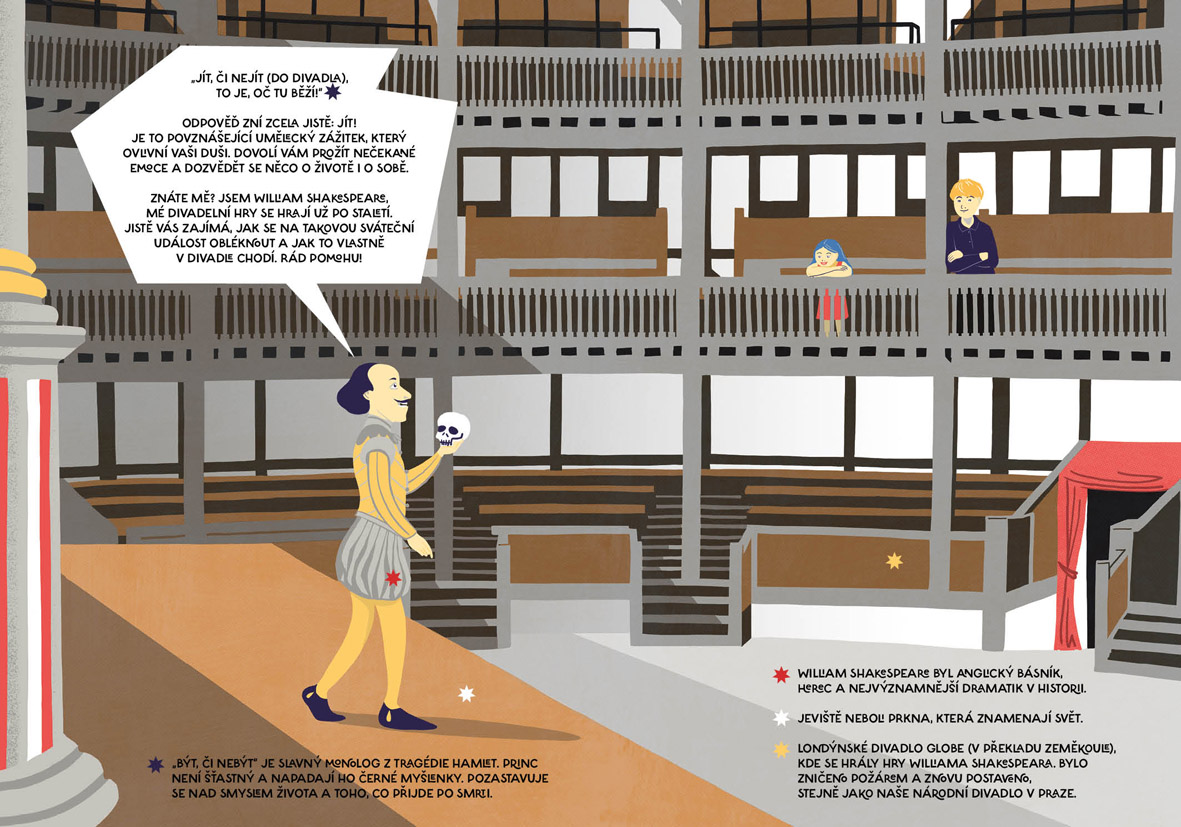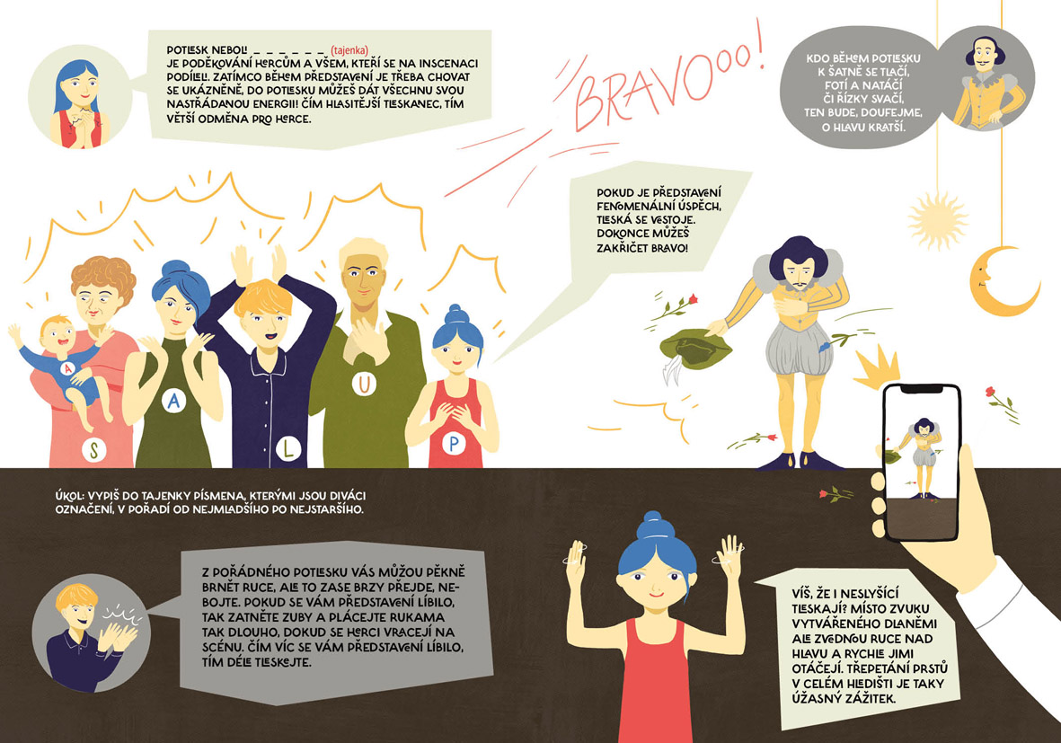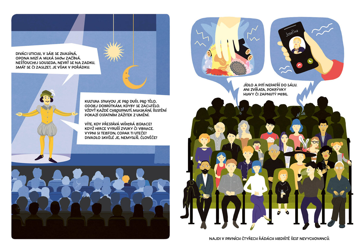 Jak se hrálo divadlo od pravěku a proč je improvizace bez scénáře senzační. Kdo všechno se podílí na divadelní inscenaci a jak přišli na svět Spejbl s Hurvínkem. Vyrobíte si papírové loutky k Tyjátru Rakéto a zjistíte, co je na taháku divadelní etikety. Najdete rozdíly v japonském divadle kabuki i nezvané hosty v divadelní šatně. Jarmil s Petkou půjdou na kouzelnické číslo a dr. Racek vysvětlí, co je to pantomima. Jója a Meli navštíví nový cirkus a detektiv Lou Davý vypátrá, kam zmizely lístky na představení světlušek. Obálku nakreslil Viktor Svoboda.
