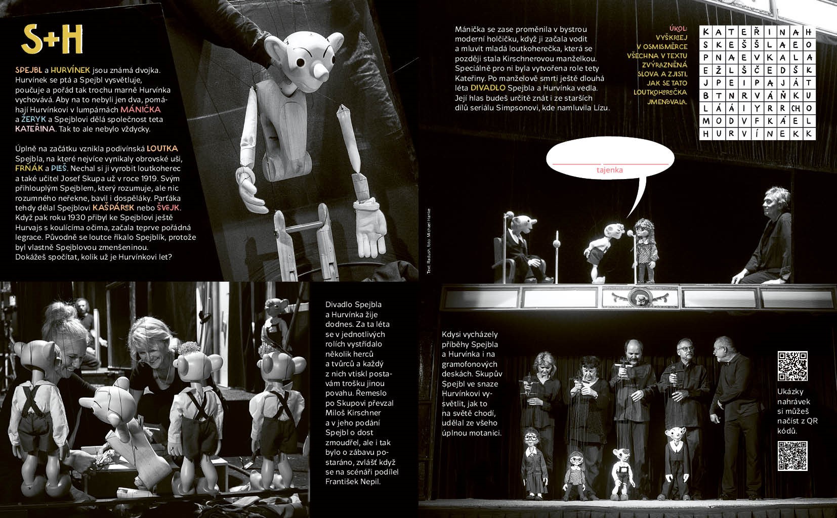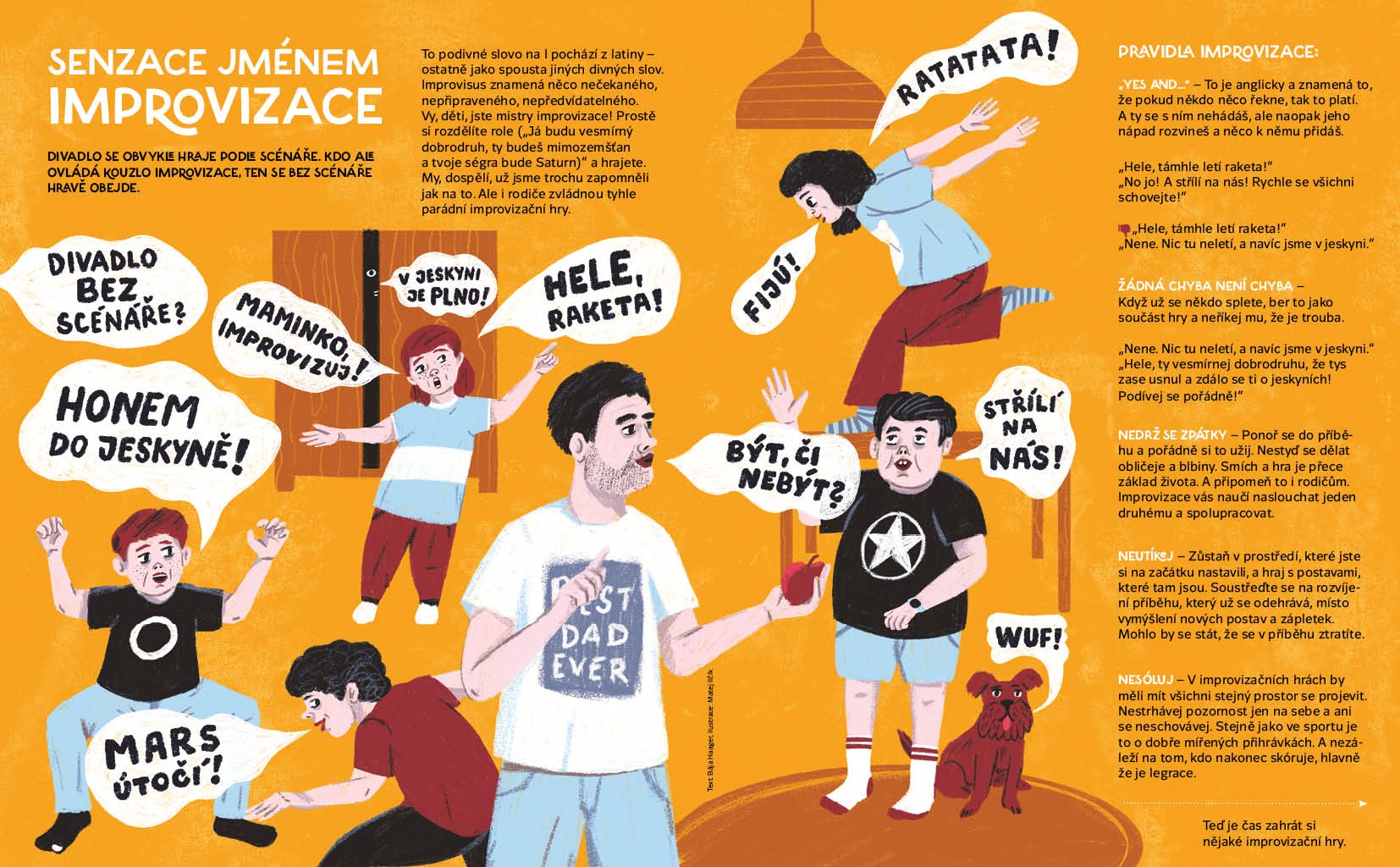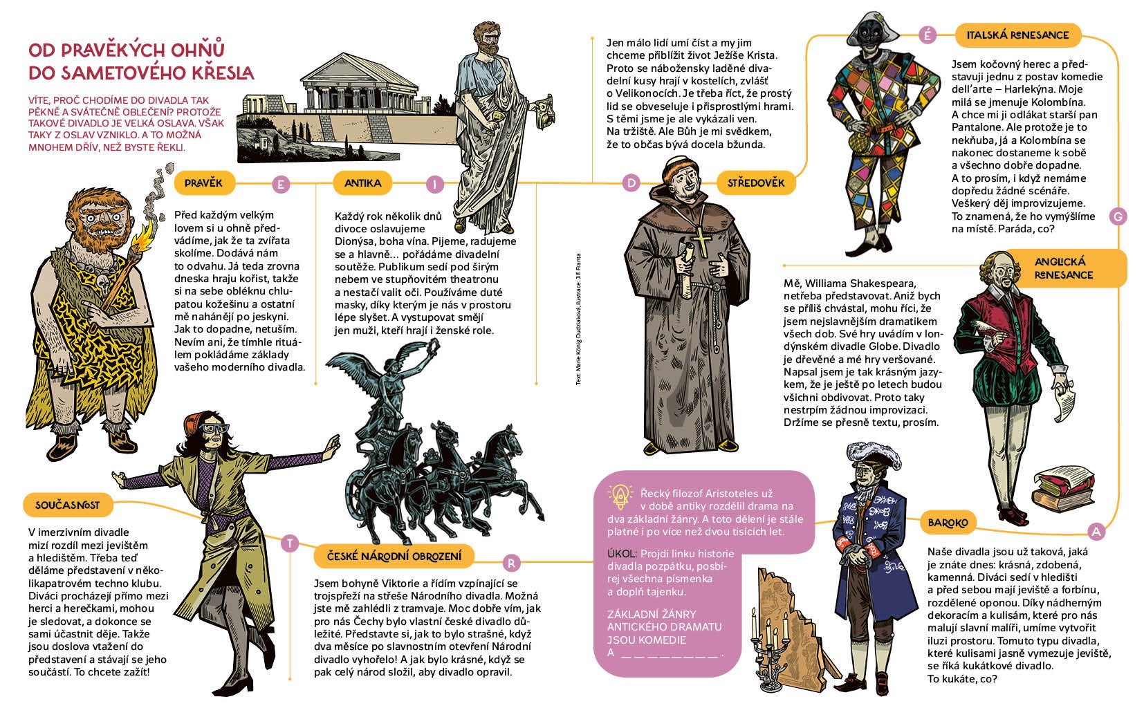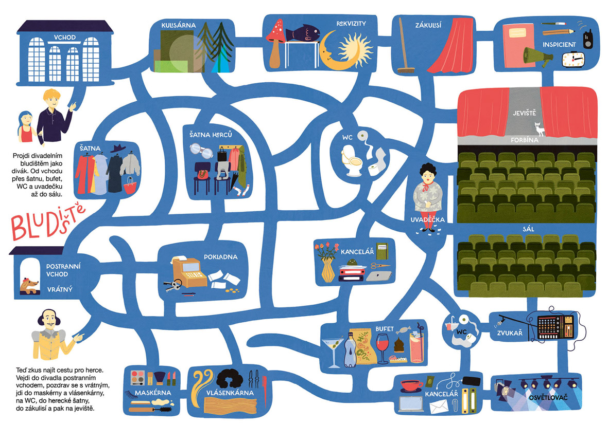 Jak se hrálo divadlo od pravěku a proč je improvizace bez scénáře senzační. Kdo všechno se podílí na divadelní inscenaci a jak přišli na svět Spejbl s Hurvínkem. Vyrobíte si papírové loutky k Tyjátru Rakéto a zjistíte, co je na taháku divadelní etikety. Najdete rozdíly v japonském divadle kabuki i nezvané hosty v divadelní šatně. Jarmil s Petkou půjdou na kouzelnické číslo a dr. Racek vysvětlí, co je to pantomima. Jója a Meli navštíví nový cirkus a detektiv Lou Davý vypátrá, kam zmizely lístky na představení světlušek. Obálku nakreslil Viktor Svoboda.