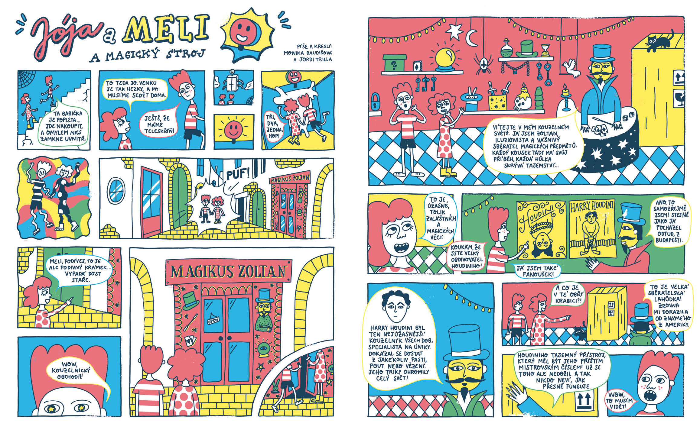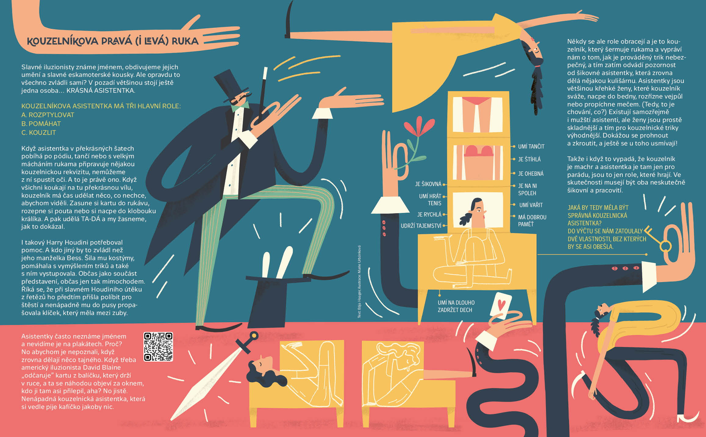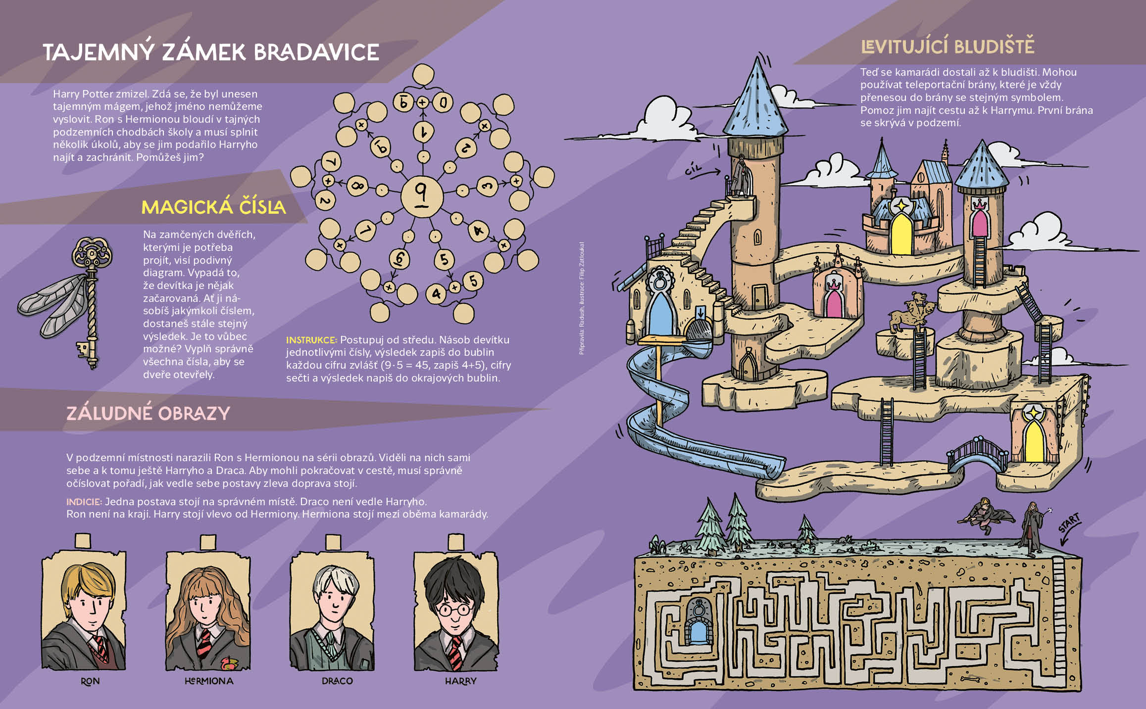 Jaké existují magické předměty a k čemu slouží. Kteří iluzionisté jsou nejslavnější a kdo jim nejvíc pomáhá. Naučíte se čarovat s tužkou i pomocí fyzikálních a chemických pokusů. Vyzkoušíte si kouzlo animace a zjistíte, jak léčí Doktor Racek rozčarovaného pana Blažka. Co odhalí hledačka v čarodějnické škole a kdo se skrývá v levitujícím bludišti v Bradavicích. Obálku nakreslil Mára Čmára.