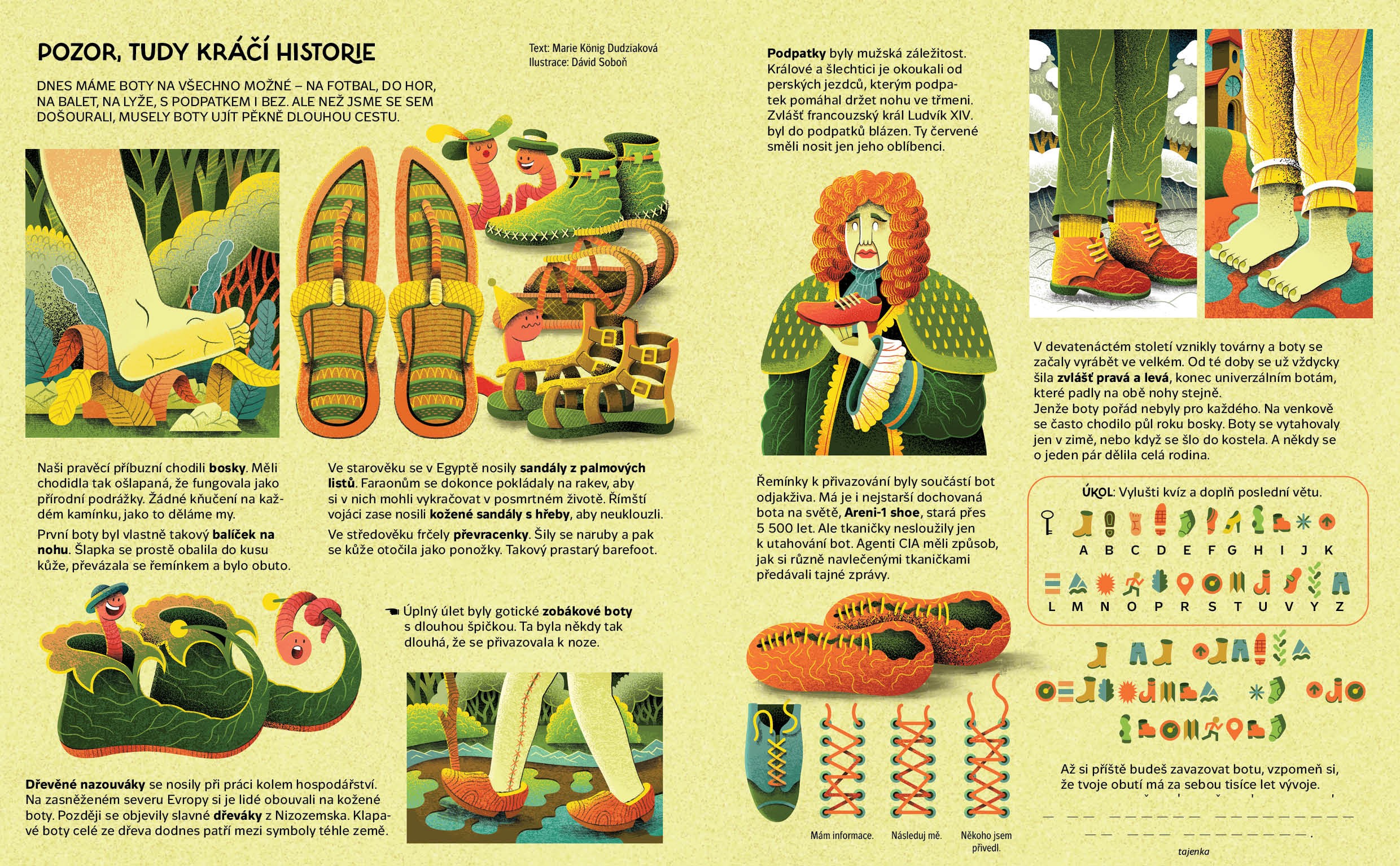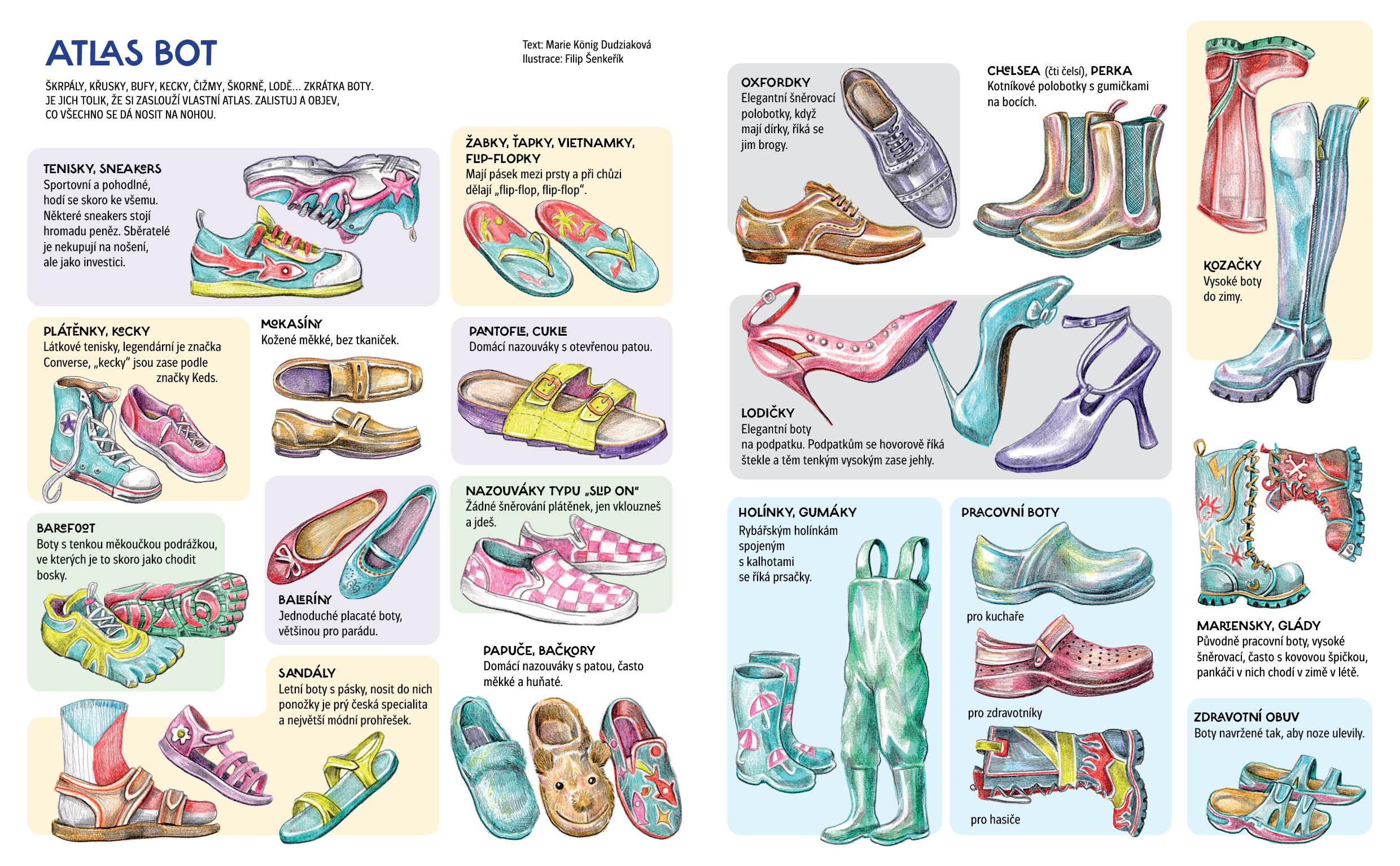 Jak vypadaly první boty a kde vznikly mokasíny. Kdo byl Baťa a kdo zanechal otisk podrážky na Měsíci. Projdete se bosky bludištěm, změříte si nohu a prohlédnete si atlas bot. Naučíte se pár trefných přísloví a odhalíte padouchy podle nalezených stop. Potkáte Kocoura v botách a Popelku v metru a naučíte se neskutečné triky při šněrování tkaniček. Marmel uloví žraloka a šnek Lou Davý vypátrá ztracený pantoflíček. Obálku nakreslila Tereza Marianová.