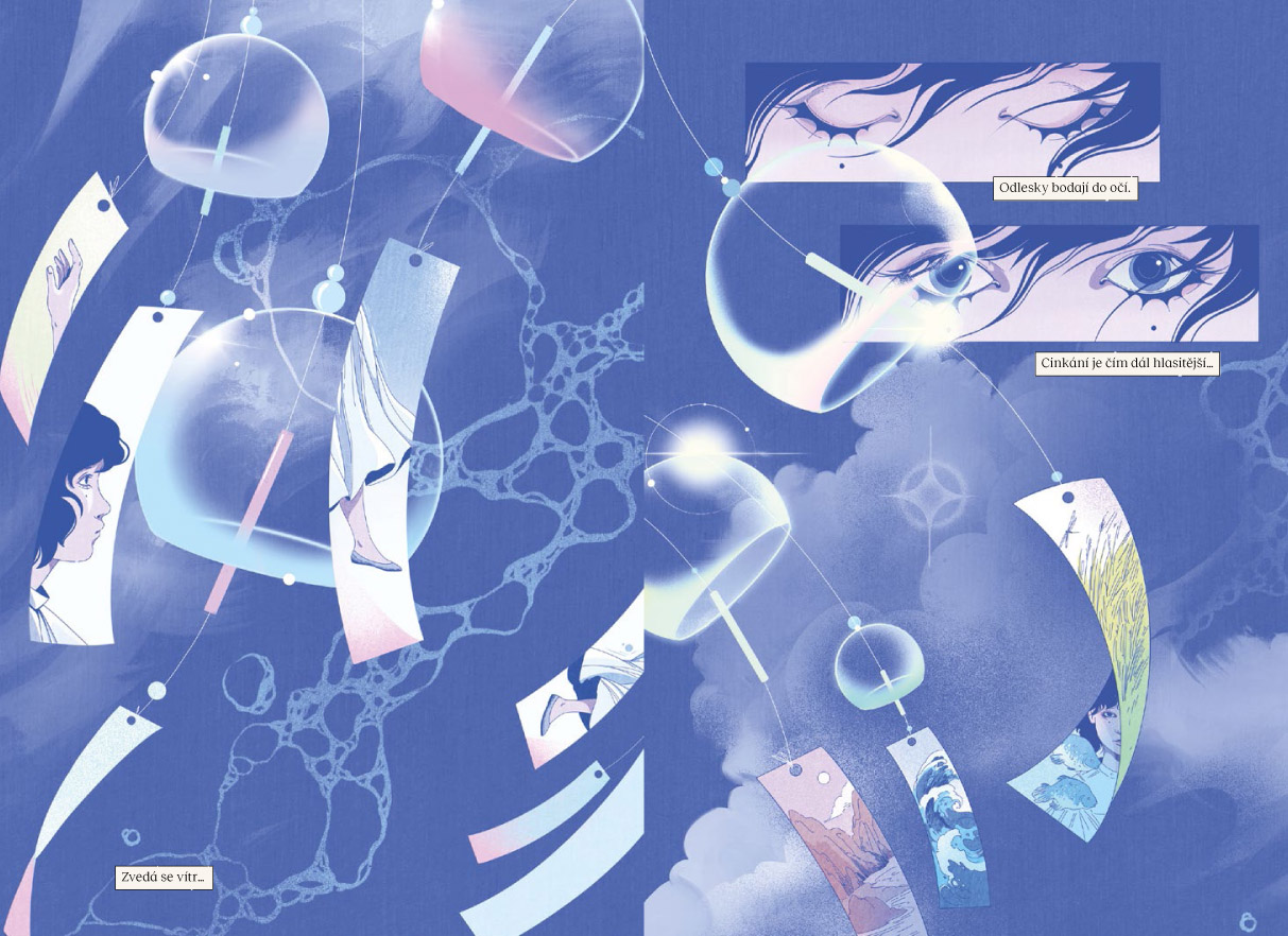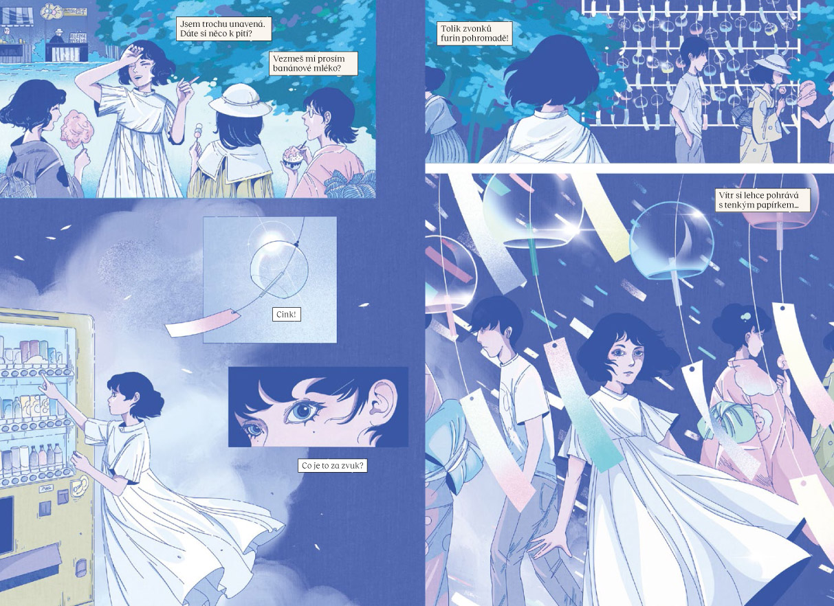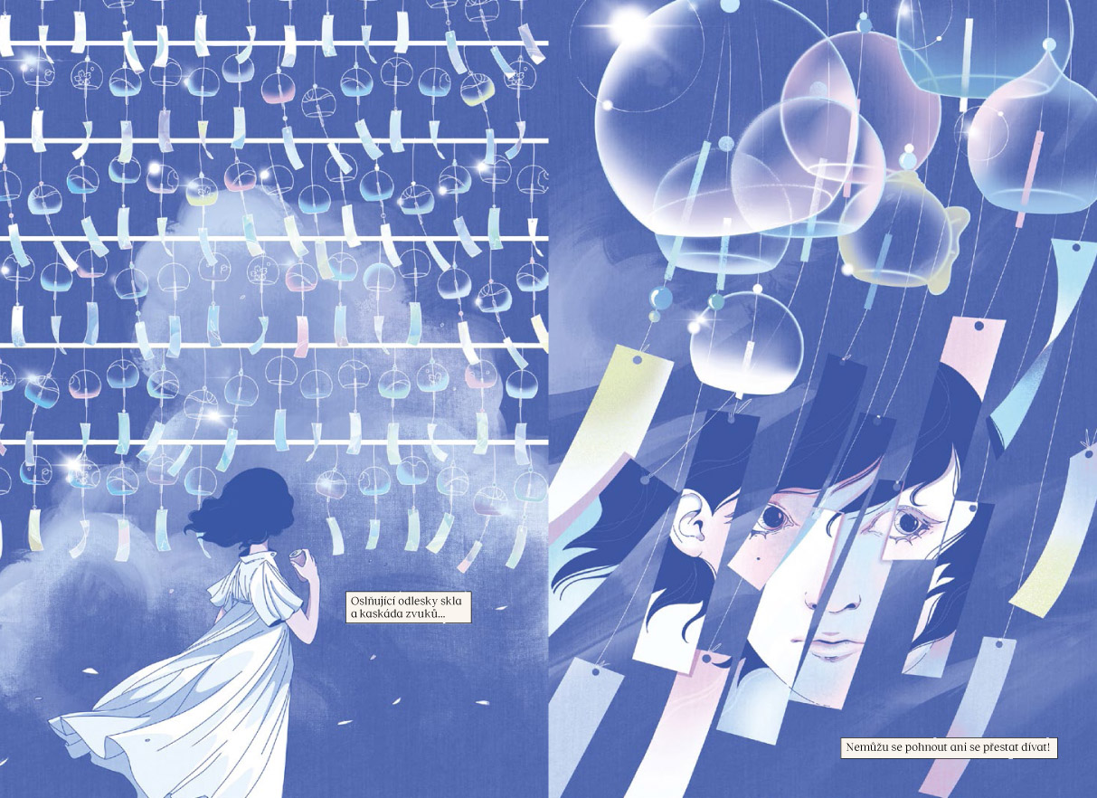 Příběh jednoho horkého letního dne, kdy se sen proplétá se skutečností. Hlavní hrdinka Akari se propadne do světa skleněných zvonků – furinů –, v němž každý nový papírový portál otevírá úplně jinou říši obývanou magickými bytostmi japonské mytologie. Mrazivá moc sněžné paní juki onna, ostré drápy tengua ani lstivý pohled lišky kicune ji nesmí svést z cesty. Srdce furinu kmitá v silném větru a otevírá stále nové, neznámé cesty. Na jejich konci se skrývá skutečné srdce léta, které musí Akari teprve objevit. — Nová kniha od autorky úspěšné mangy V OKU LIŠKY.