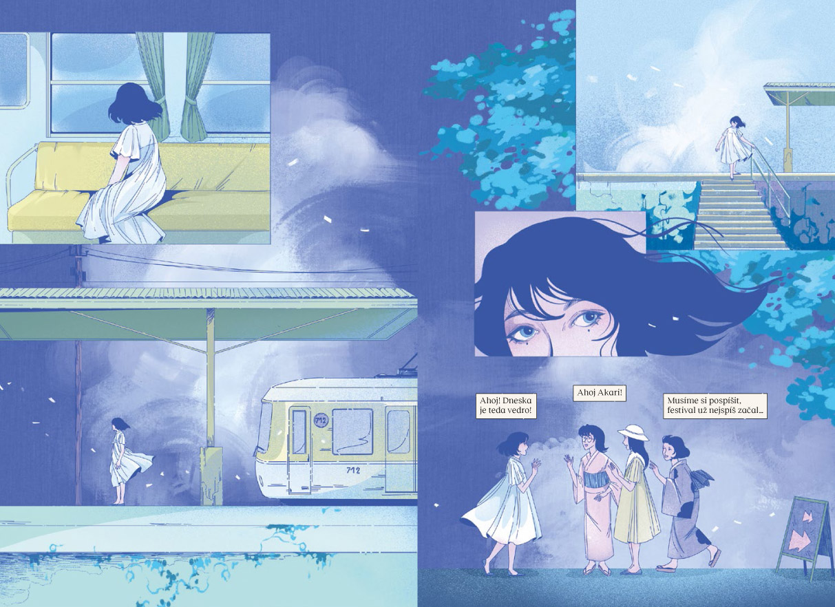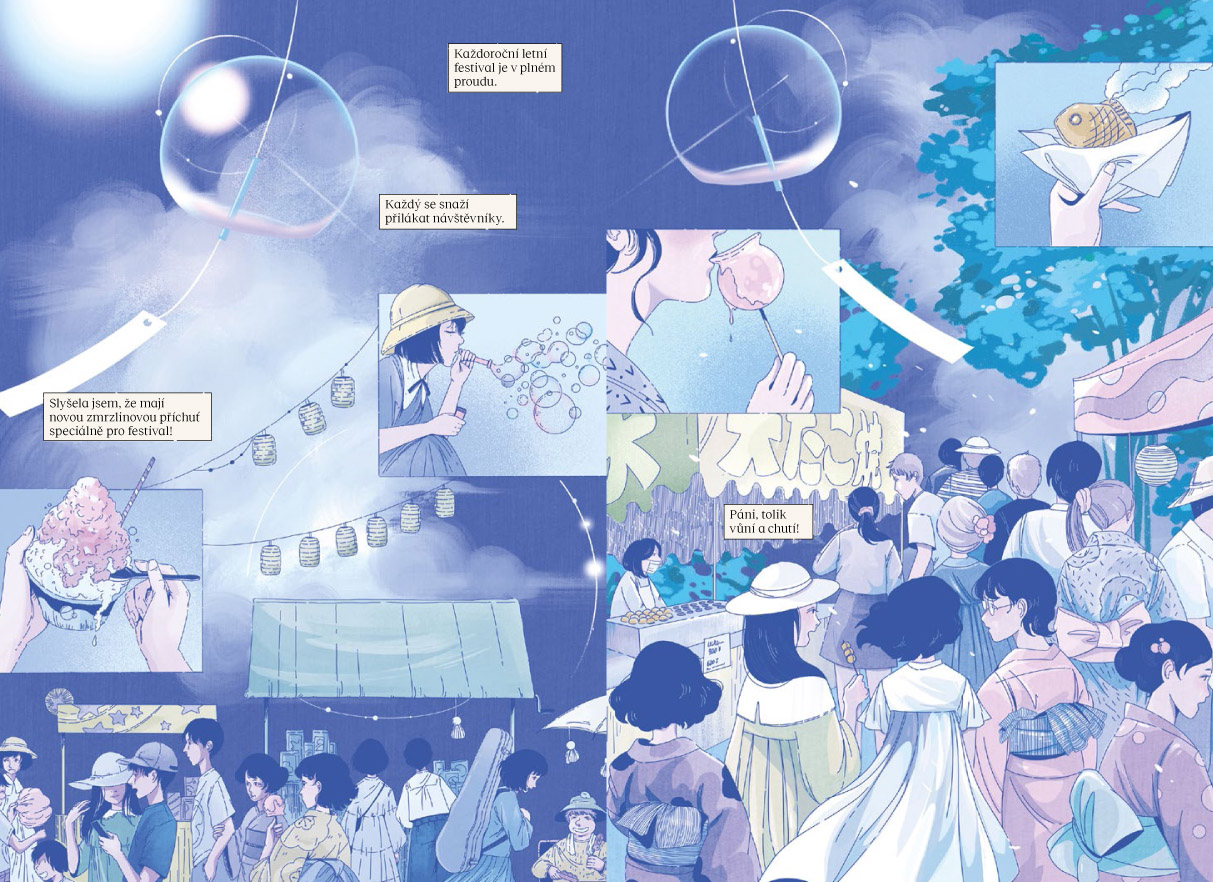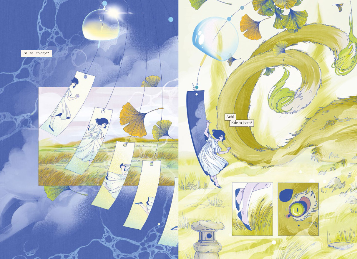 Příběh jednoho horkého letního dne, kdy se sen proplétá se skutečností. Hlavní hrdinka Akari se propadne do světa skleněných zvonků – furinů –, v němž každý nový papírový portál otevírá úplně jinou říši obývanou magickými bytostmi japonské mytologie. Mrazivá moc sněžné paní juki onna, ostré drápy tengua ani lstivý pohled lišky kicune ji nesmí svést z cesty. Srdce furinu kmitá v silném větru a otevírá stále nové, neznámé cesty. Na jejich konci se skrývá skutečné srdce léta, které musí Akari teprve objevit. — Nová kniha od autorky úspěšné mangy V OKU LIŠKY.